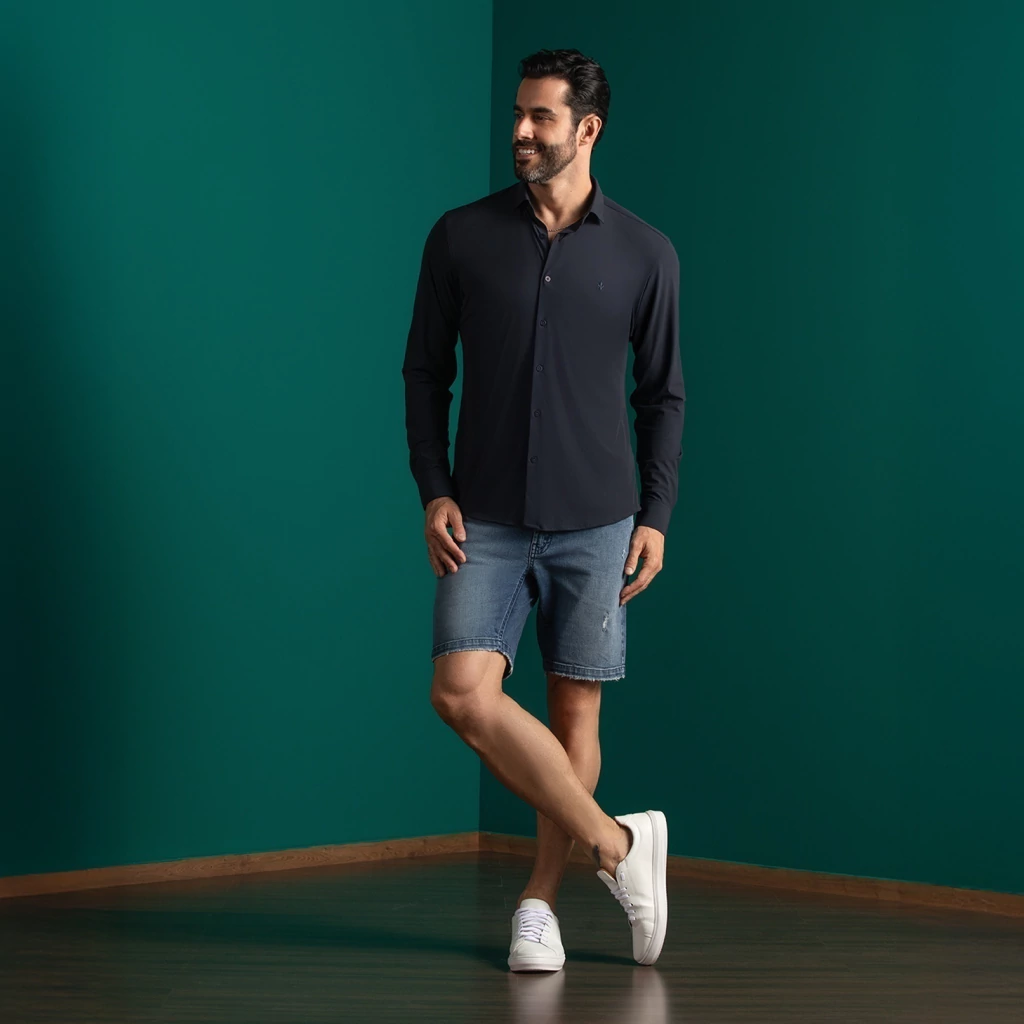 Versátil, combina com jeans, calças de alfaiataria ou bermudas, sendo uma peça-chave no guarda-roupa masculino.